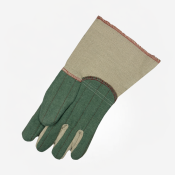 Heat-resistant green hot mill gloves with extended gauntlet cuff for forearm coverage. Designed for steel plants, foundries, glass factories, and forging industries, these industrial protective gloves provide reliable safety when handling hot materials and equipment.