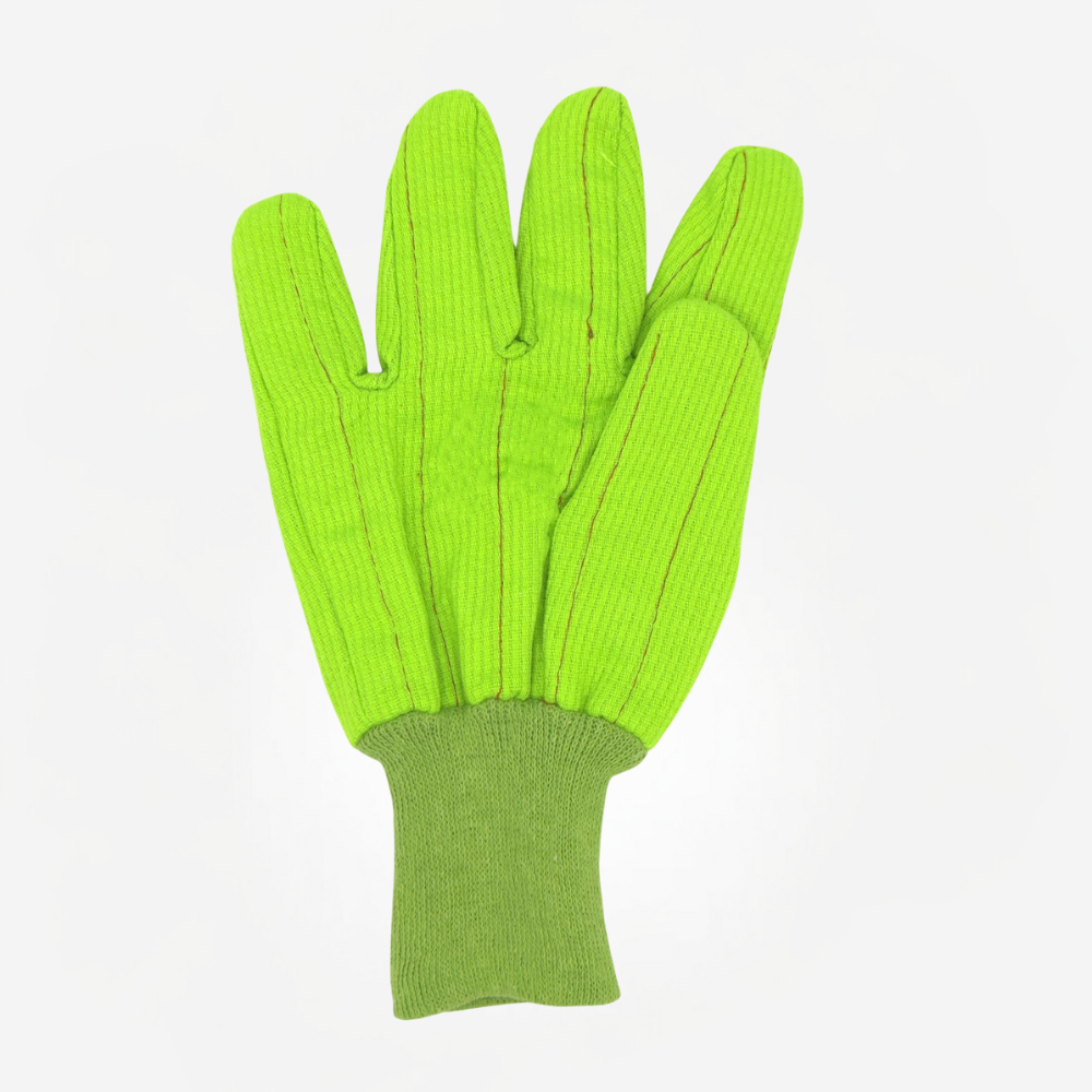 High-visibility green corded glove with reinforced double palm, sturdy Clute cut, and excellent abrasion resistance for safer handling.